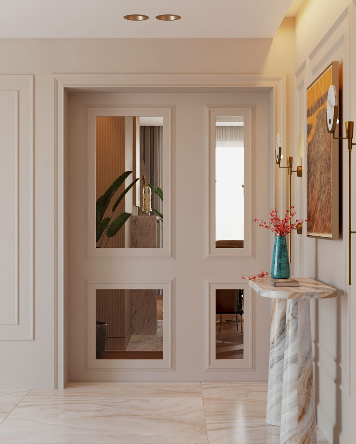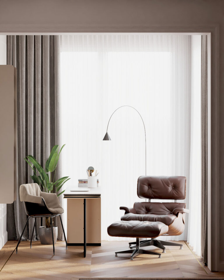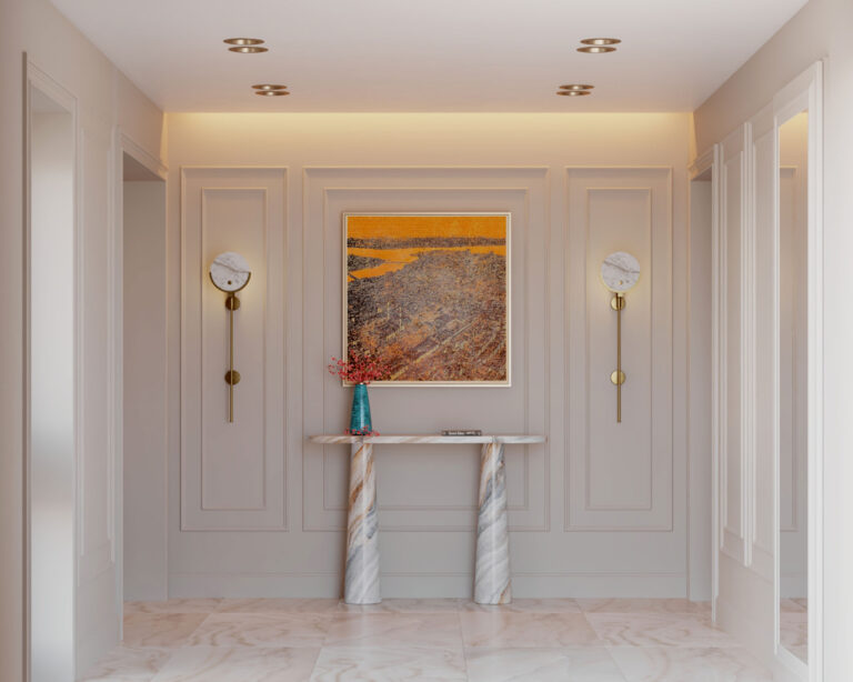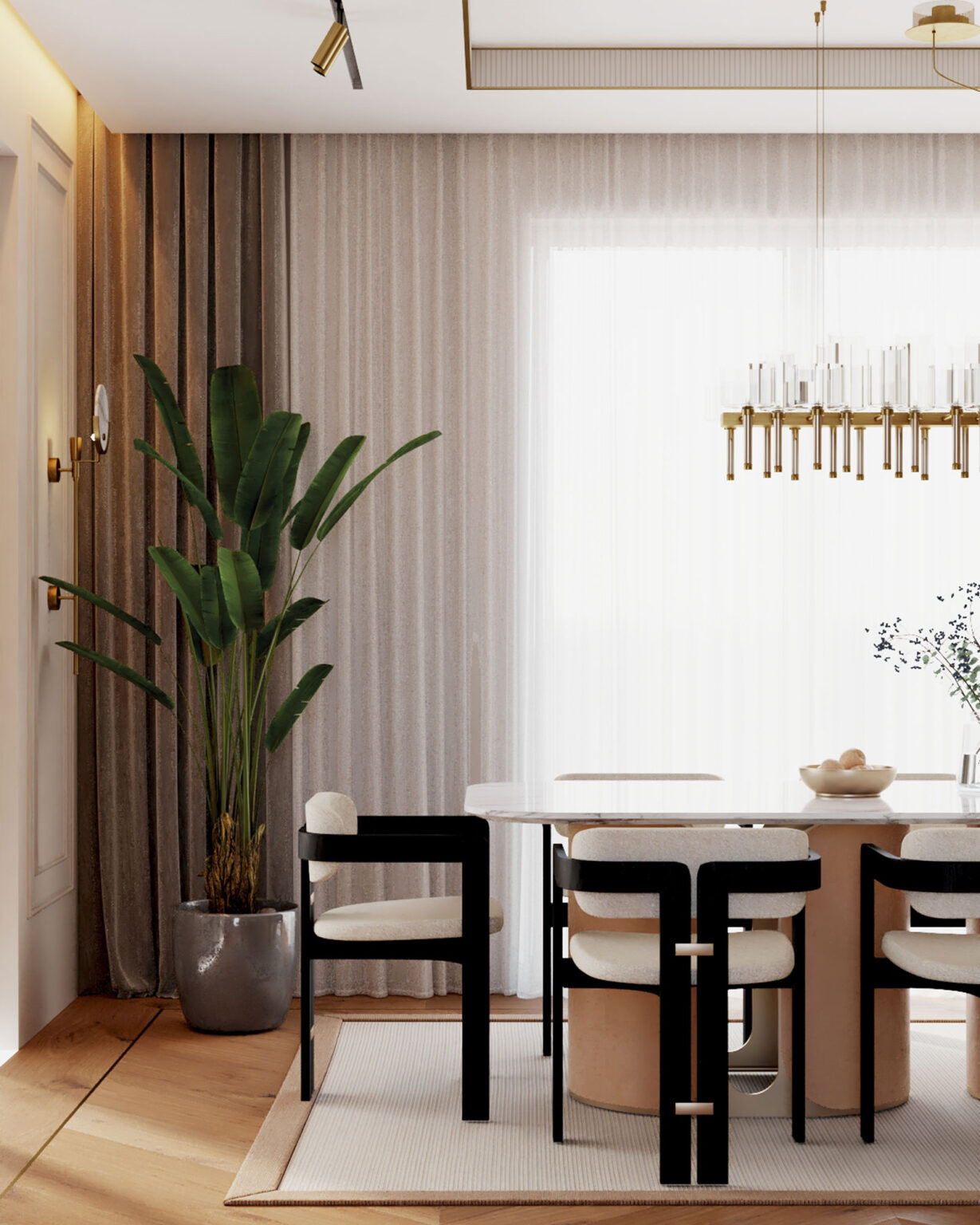 Projede doğal dokular ve yalın çizgiler, bütüncül bir görsel akış yaratmak için bir araya getirildi. Ahşap, taş ve dokulu yüzeyler; nötr tonlarla dengelenerek mekânlarda huzurlu bir atmosfer sağladı. Bu malzeme birlikteliği yalnızca görsel sürekliliği değil, aynı zamanda sıcak ve davetkâr bir yaşam hissini de pekiştirdi. Her oda, bir sonrakinin doğal uzantısı gibi kurgulanarak bütün dairede uyumlu bir yaşam deneyimi oluşturuldu.